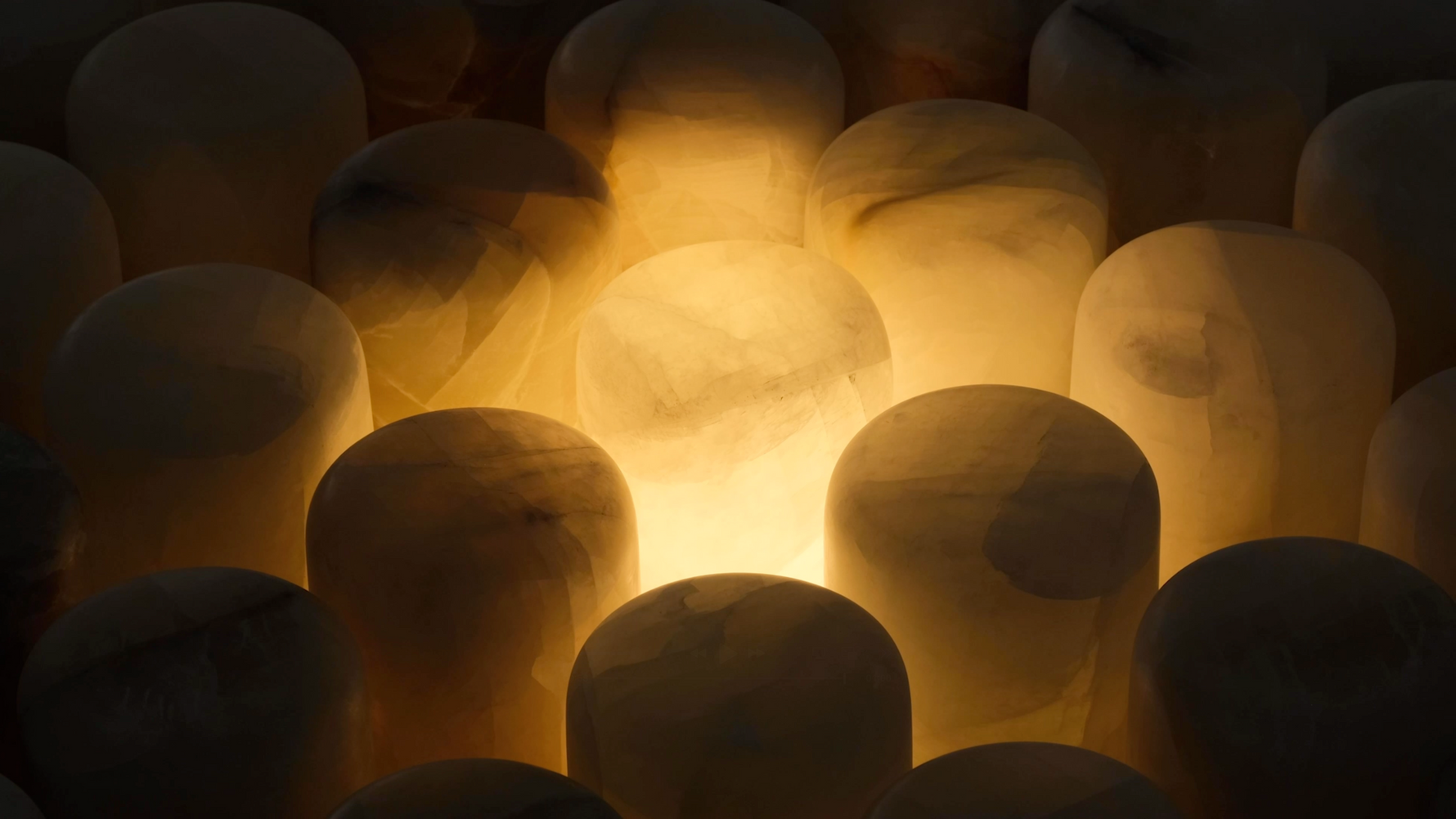 Offered in two sizes, the Calcite Vessel layers beautifully displayed solo, paired as a set, or grouped to create a soft constellation of glow. No two are alike: natural veining and mineral clouds make each piece uniquely yours.