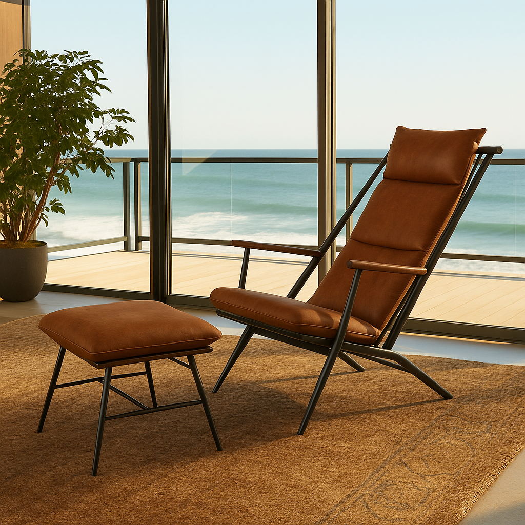 Evoking the quiet dignity of a seasoned mariner’s return, the Fisherman’s Rest Chair is a sculptural homage to endurance, solitude, and grace. Hand-welded steel frames the silhouette with precision, while full-grain leather—finished in a rich oil-wax patina—invites with the softness of down-filled cushions. The reclined angle mimics the posture of rest after long journeys, and the companion ottoman completes the ritual of repose. Each crease in the leather, each curve in the metal, tells a story of wind, salt, and stillness.