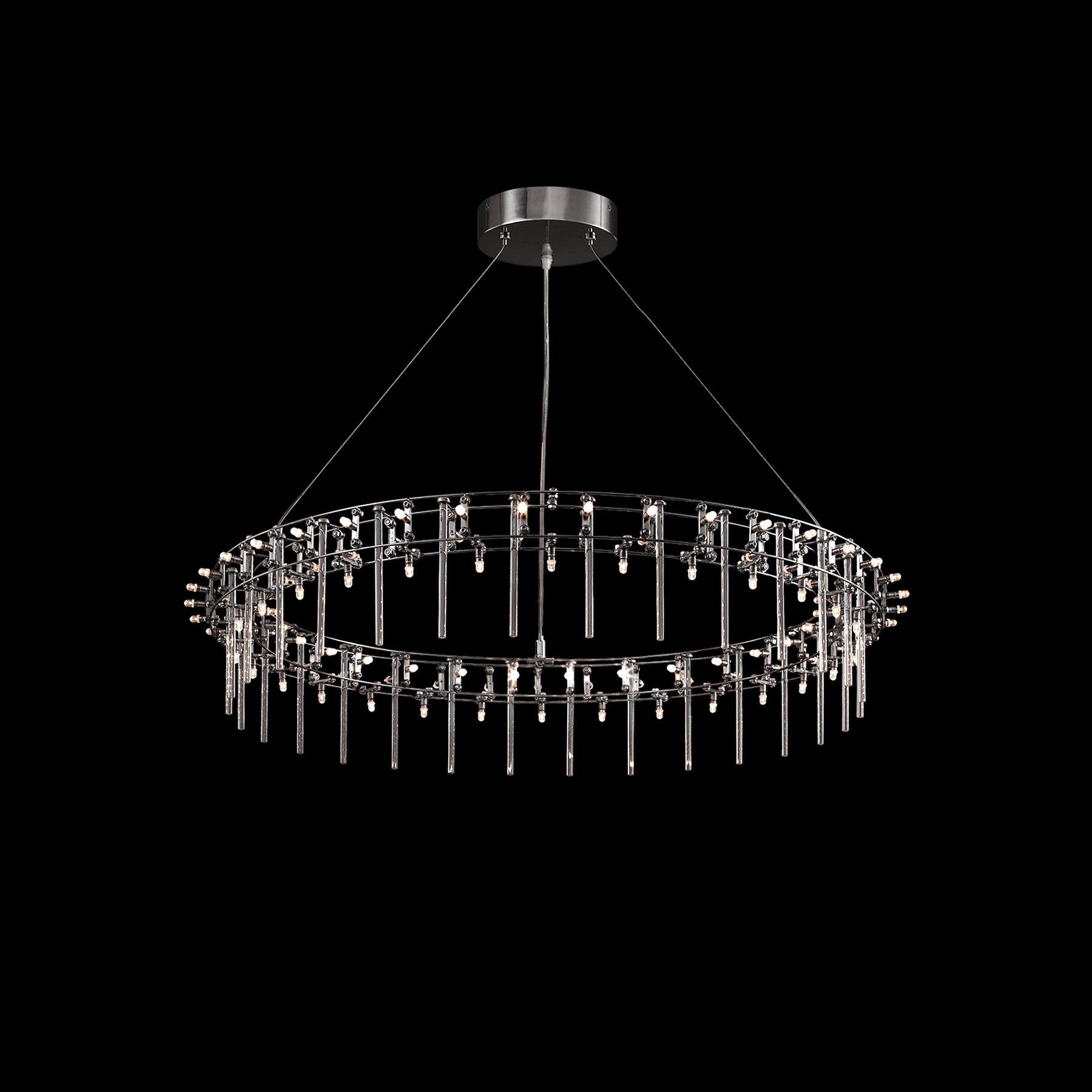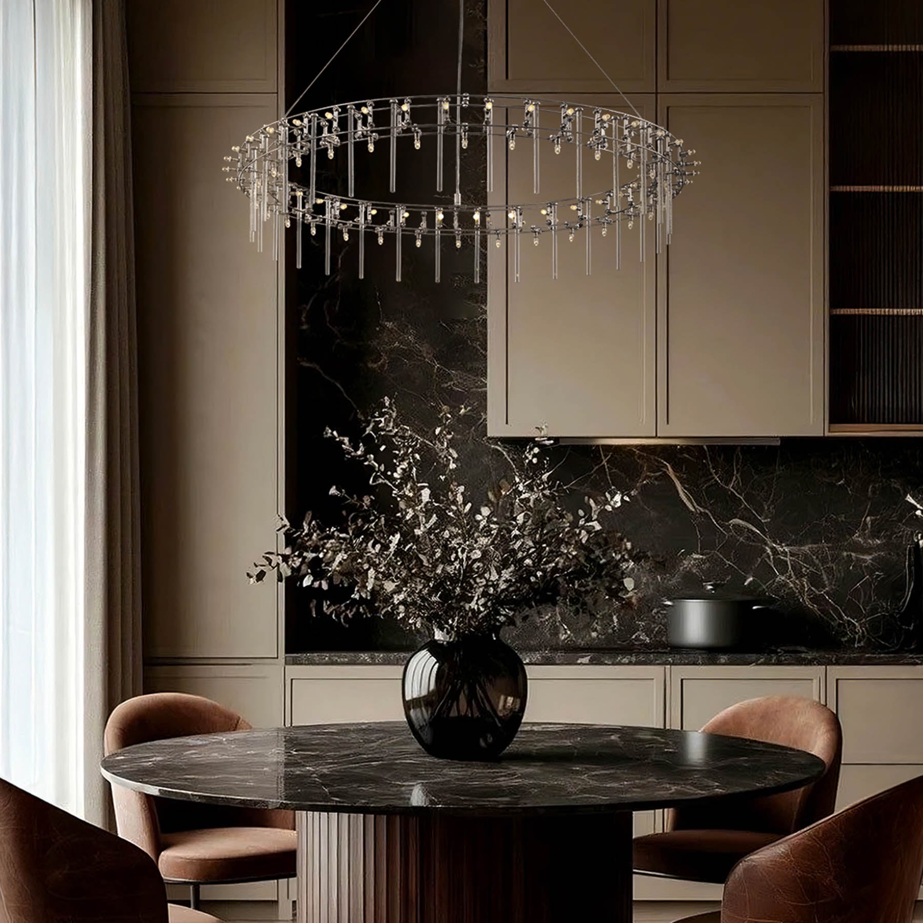 - Dia 60" Suited to grand dining, great rooms, long bars, or showroom vignettes where a luminous focal point defines the zone. In double-height spaces, hang slightly higher to keep the ring floating in view.
