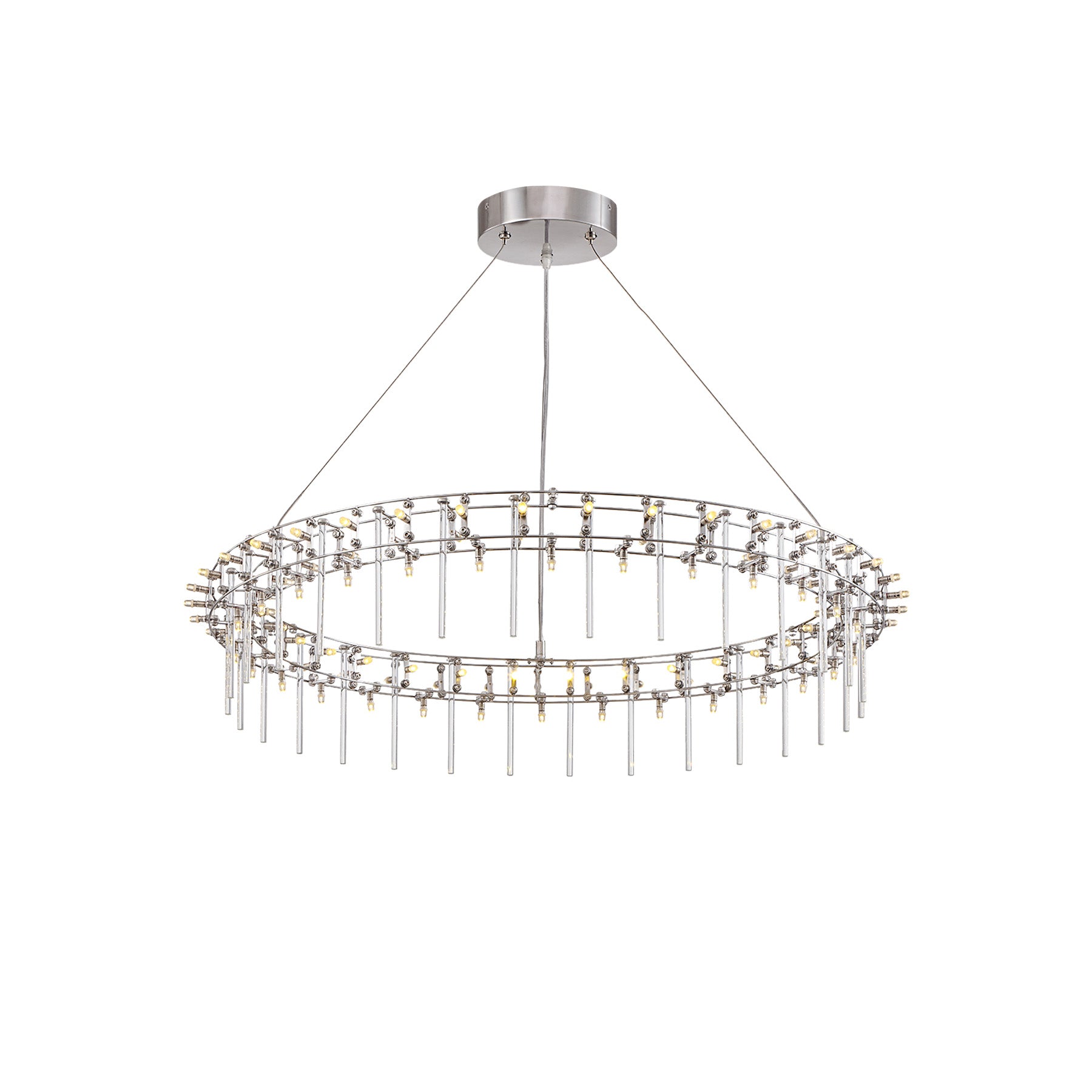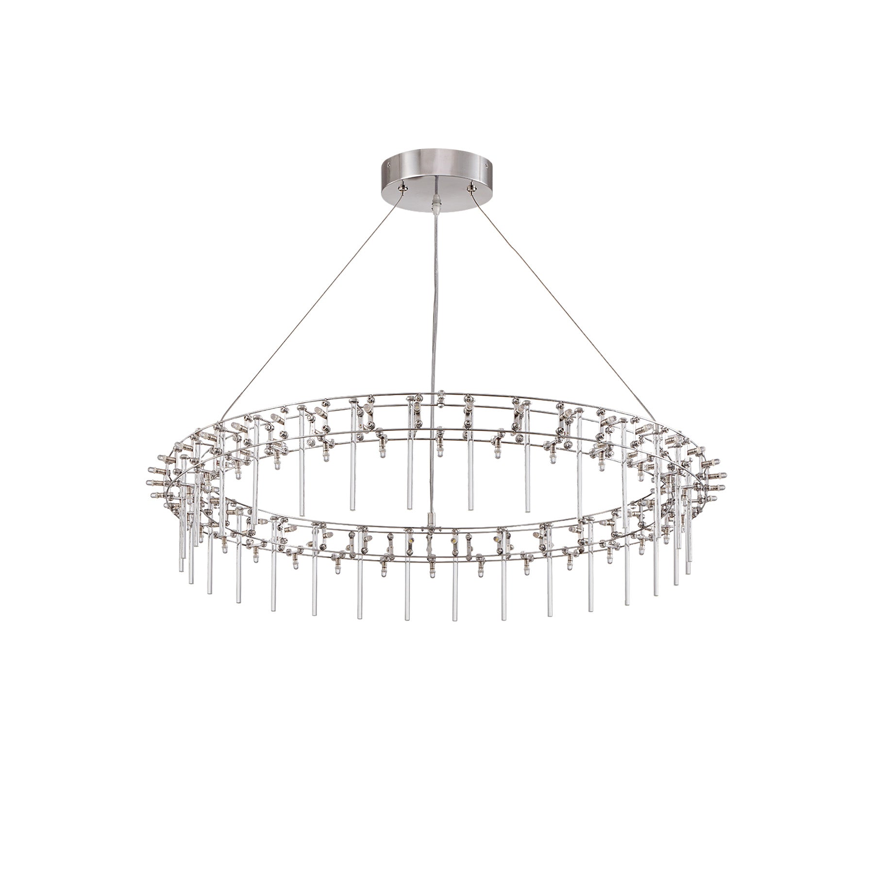 - The polished-nickel ring and clear glass rods create crisp shimmer. Balance the gleam with low-sheen, natural surfaces—white/bleached oak, travertine or honed marble, ivory boucle, nubuck/soft leather—to enhance the halo effect. Layer with dimmable downlights or wall washers to extend sparkle across walls and stone backsplashes. Works beautifully with minimalist, luxe modern, or statement glam interiors; echo the ring geometry with round tables and soft, curved silhouettes.