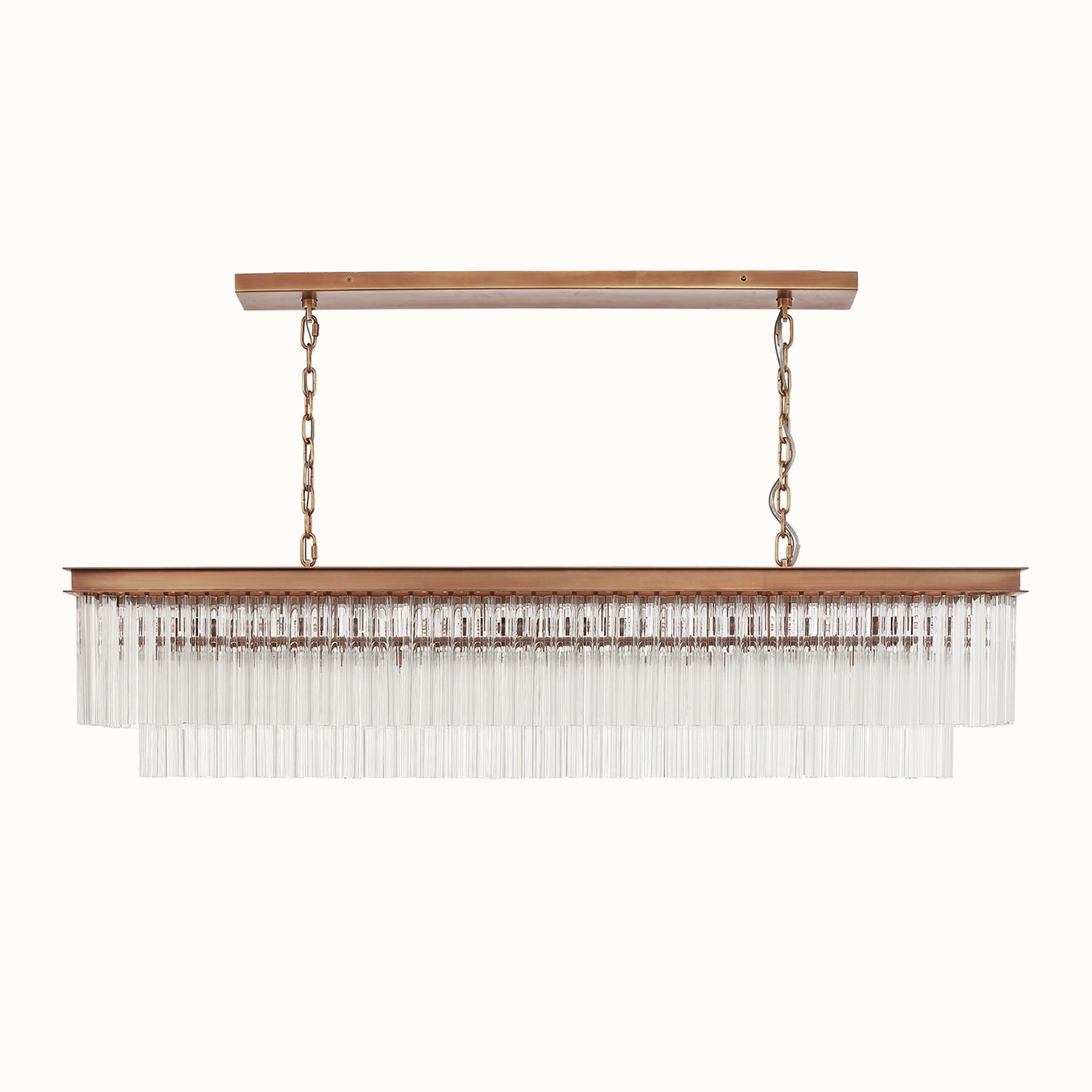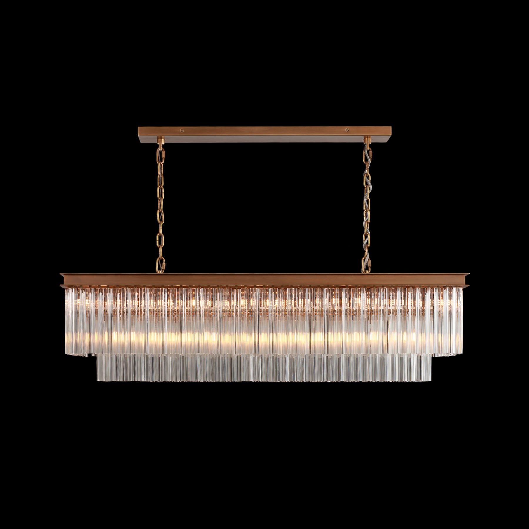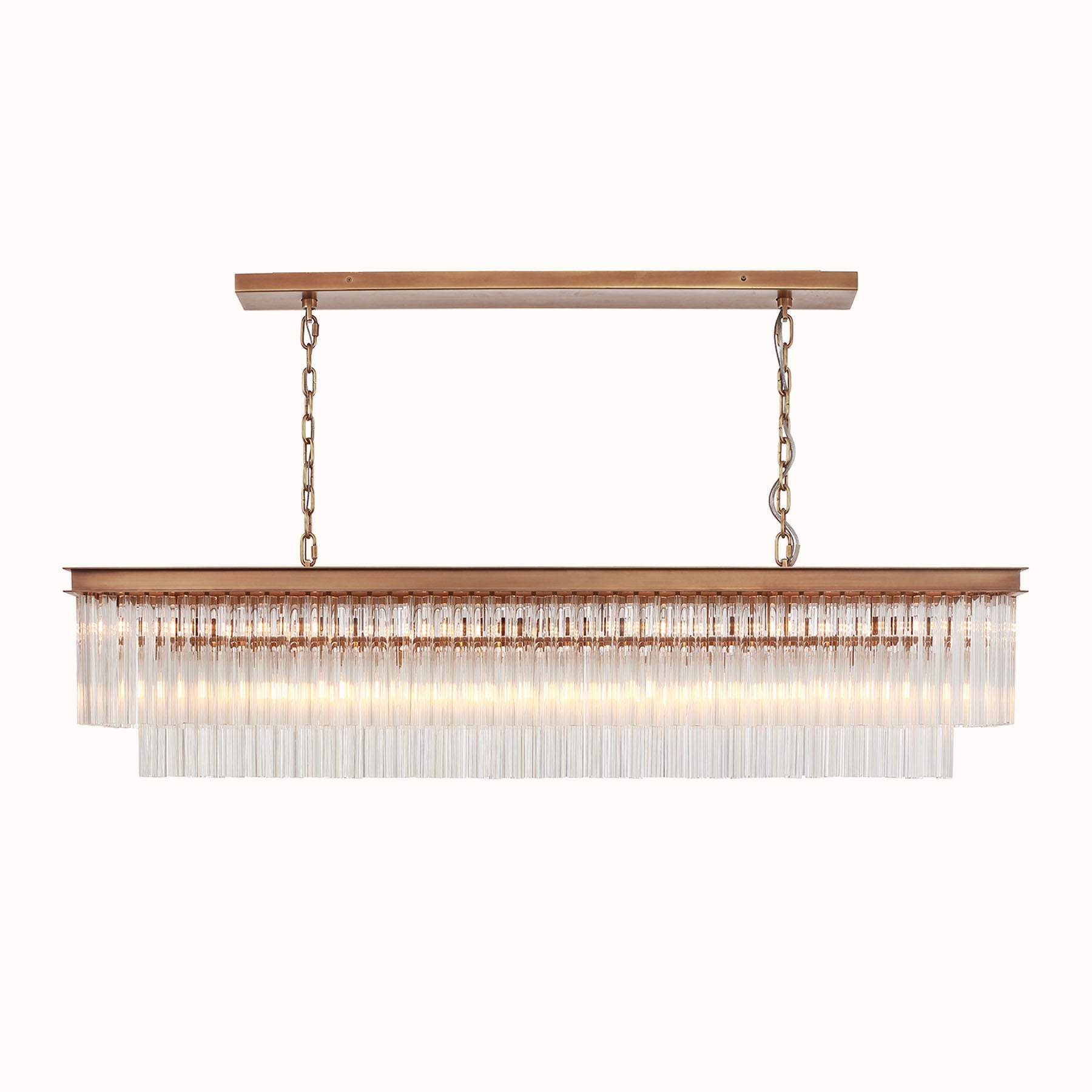 A study in line, structure, and poise. The Marais Rectangular Chandelier extends the series’ tiered glass-rod language across a linear plan. Vertically aligned rods step in long, measured terraces, composing a luminous proscenium—precise at the edges, fluid through the center. Suspended beneath a warm satin-brass rail with fine cabling, the silhouette seems to float, balancing architectural discipline with an inviting glow.