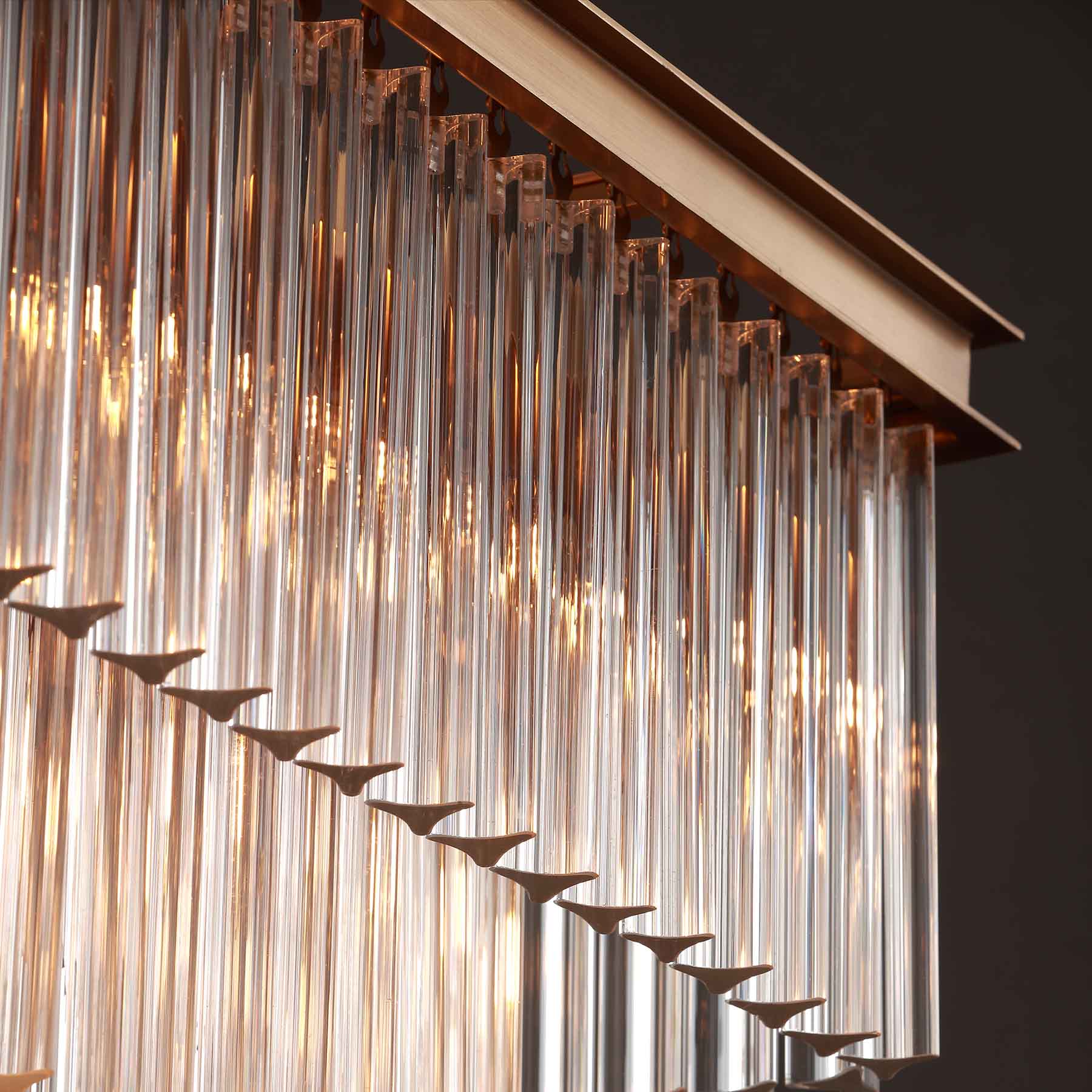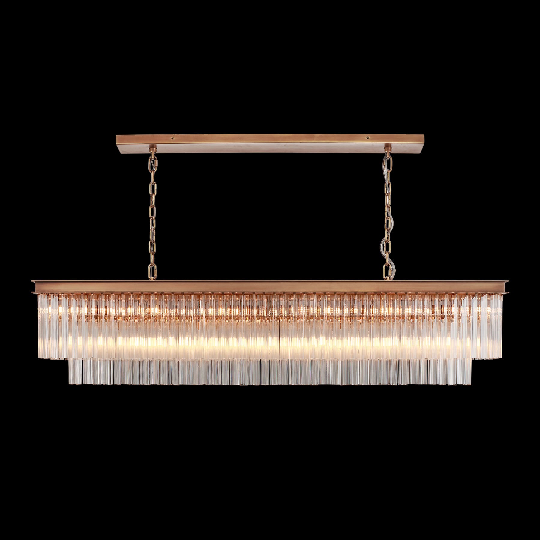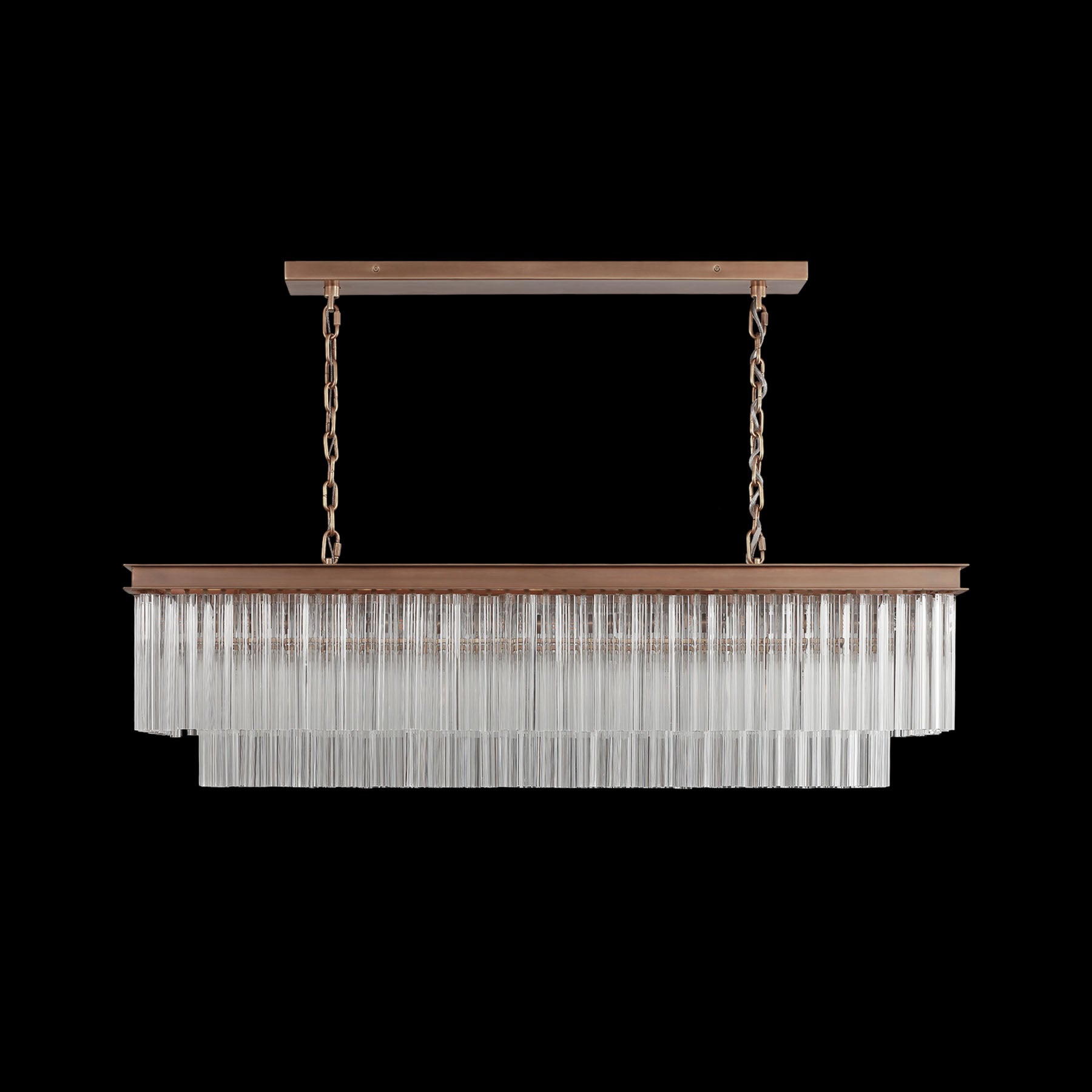 A study in line, structure, and poise. The Marais Rectangular Chandelier extends the series’ tiered glass-rod language across a linear plan. Vertically aligned rods step in long, measured terraces, composing a luminous proscenium—precise at the edges, fluid through the center. Suspended beneath a warm satin-brass rail with fine cabling, the silhouette seems to float, balancing architectural discipline with an inviting glow.